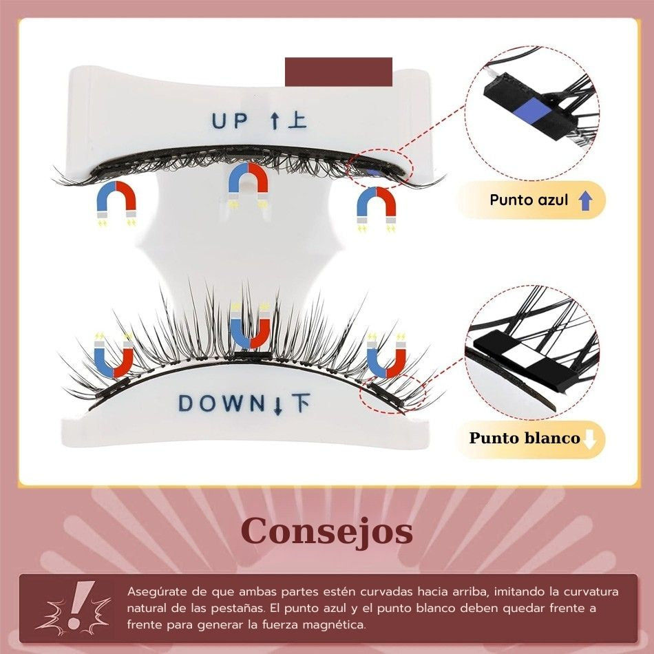 Cada ojo recibe dos piezas magnéticas para pestañas. Estas piezas simplemente se unen alrededor de tus pestañas naturales para una sujeción segura y sin pegamento.